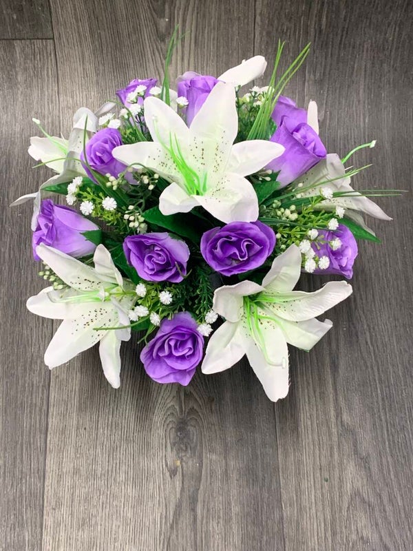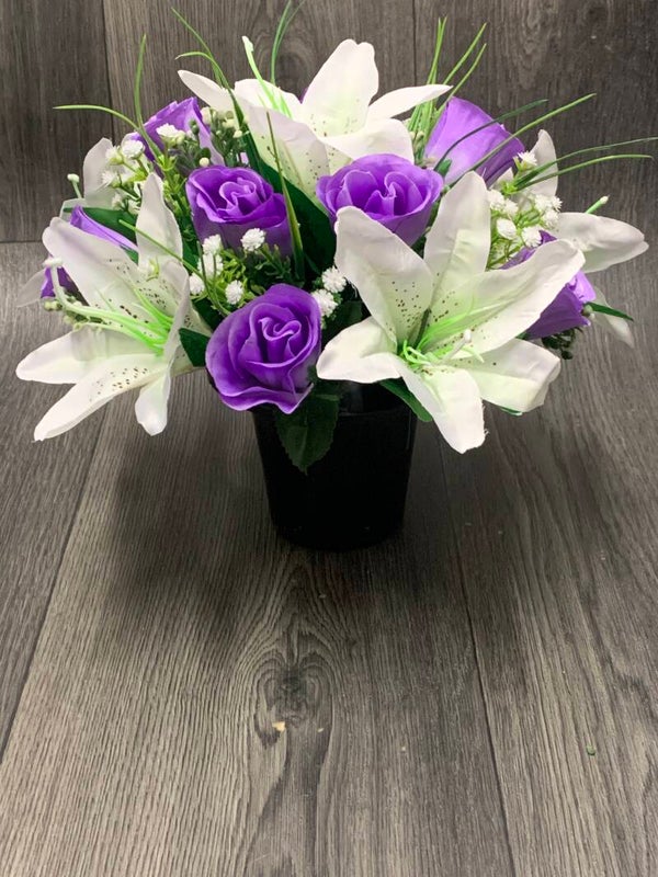 These beautiful pots are made up with lilies,rose,gyp and greenery. Built in a 10cm black plastic grave pot. These pots are weighed.
