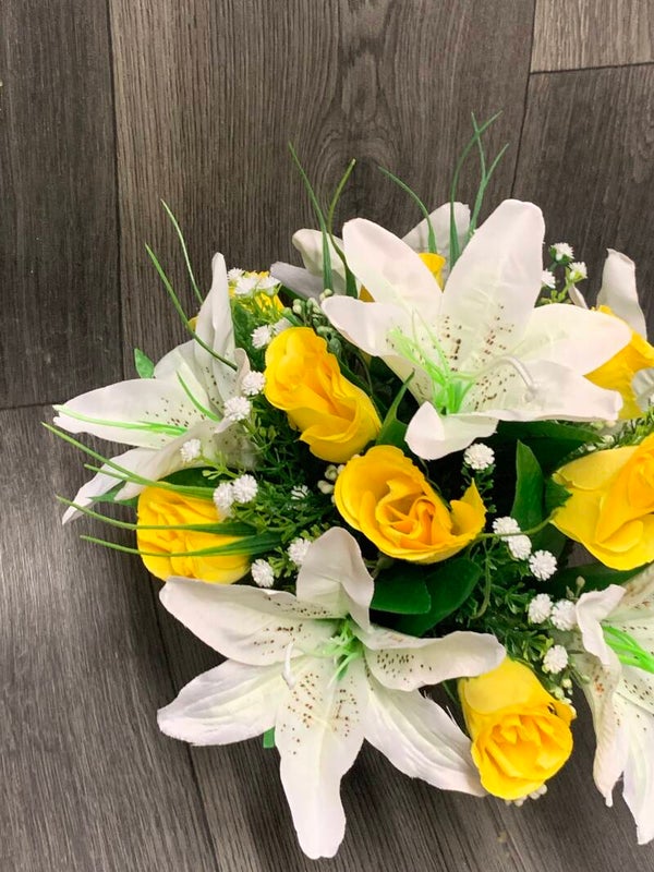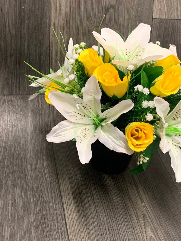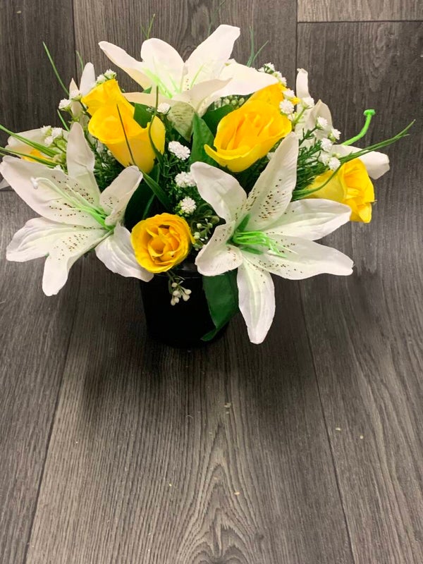 These beautiful pots are made up with lilies,rose,gyp and greenery. Built in a 10cm black plastic grave pot. These pots are weighed.