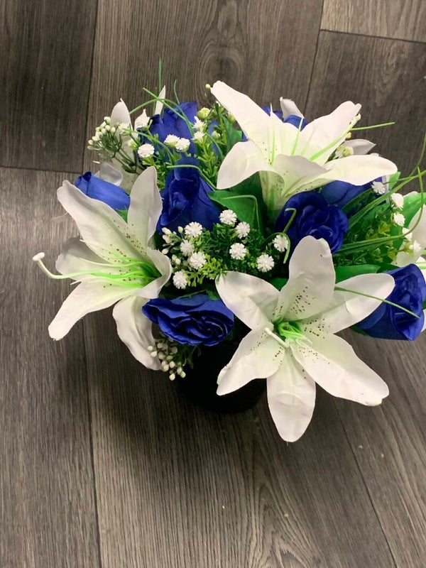 These beautiful pots are made up with lilies,rose,gyp and greenery. Built in a 10cm black plastic grave pot. These pots are weighed.